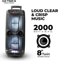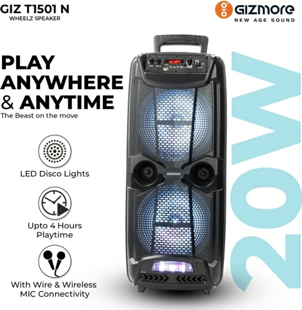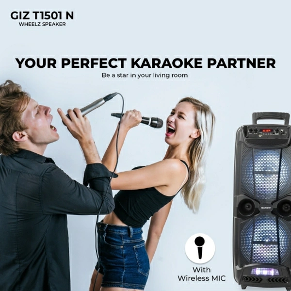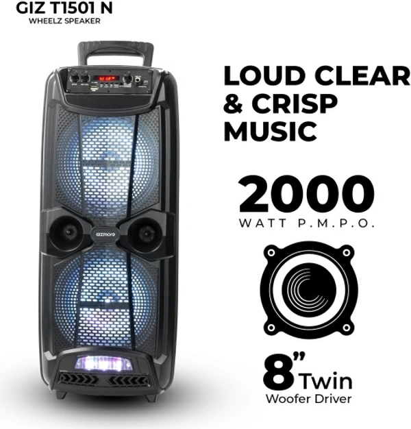Gizmore GIZ WHEELZ T1501N Portable Bluetooth Party Speaker 2000W P.M.P.O with Wireless Mic Input. 20 W Bluetooth Home Theatre
